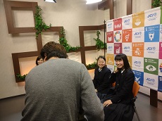 地域課題に取り組むビジネスモデル1年次生の太宰亜子さん(児島中出身)と岩﨑朱音さん(児島中出身)の2人が、倉敷JC情報局「くらプレ!」の収録のため、倉敷ケーブルテレビを訪問しました。これはSDGsの17ある目標の中の11番目「住み続けられるまちづくりを」をテーマに、本校生徒のほかに倉敷中央高校、倉敷商業高校の生徒とともに収録をおこないました。この番組は倉敷ケーブルテレビで4月から放送予定です。