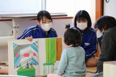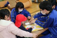 本日、味野にあるP.P.P.ヒマワリ!児島の園児らが、津波を想定した避難訓練実施のため、本校を訪れました。本校は倉敷市の避難所に指定されています。実際に地域の方々が避難してきたとき、高校生として何が出来るのかを考える良い機会となりました。リーダの方々と協力して人員や避難物資の整理など高校生は大きな戦力です。今回は2年次保育モデルの生徒は実際に園児が避難してきたとき、保育モデルの生徒として何が出来るのかを考えました。生徒は園児らの心のケアも考え、保育士の先生方と協力して紙芝居や絵本の読み聞かせ、お手玉や風船を使った手遊びなどで楽しませることを考えました。園児にとっては初めての場所で、知らないお兄さんとお姉さん。部屋には見たこともないものばかりで落ち着かない様子でしたが、だんだんと打ち解けて楽しめるようになりました。