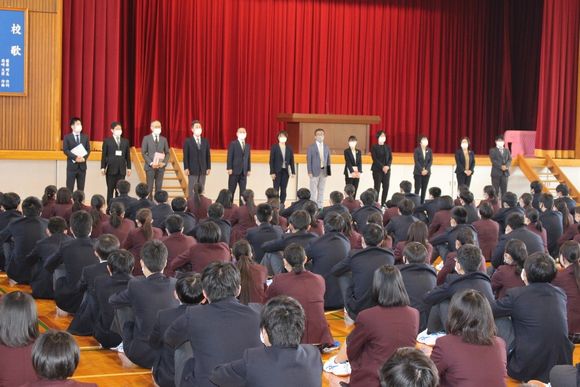 生徒会長3年1組原さんからは、3年次生は進路に向けた準備をすること、2年次生はコースで深く学ぶ学年となることなどに触れ、気持ちを新たに頑張りましょうと呼びかけがありました。