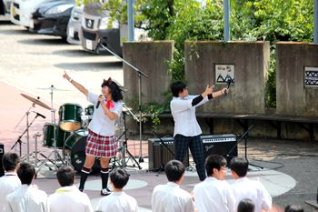 1年次生のモニュメント展示、2次年生のクラス展示、3年次生の模擬店、文化部や各種委員会による展示や発表、PTAによるバザーが行われ、校内が非常に賑やかです。中庭では有志バンドの演奏も行われ、非常に盛り上がりました。