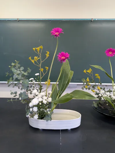 池坊師範の先生にご指導いただきながら、基礎から丁寧に学ぶことができます。普段の活動は和やかな雰囲気で、みんなで楽しくお花と向き合っています。